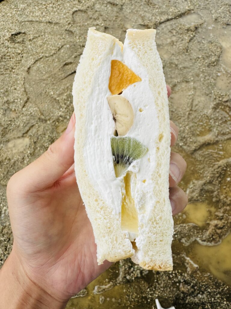 フルーツサンドの見た目はこんな感じです。雨の中での販売だったので周りもジメジメしていたのですが、商品自体は美味しく食べる事が出来ました。
