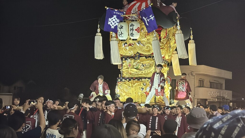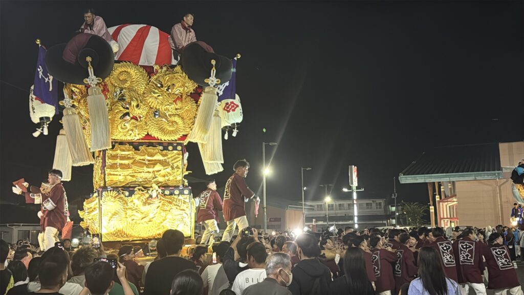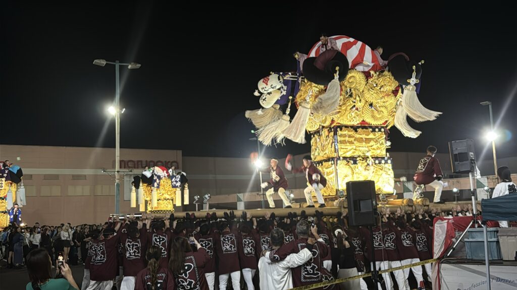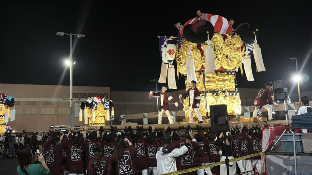 そして所変わって夜の様子もご紹介。辻地区のお祭りでは毎年、宵祭りの夜にマルナカ山本店に4台の太鼓台が集まり、勇壮なかきくらべを披露します。