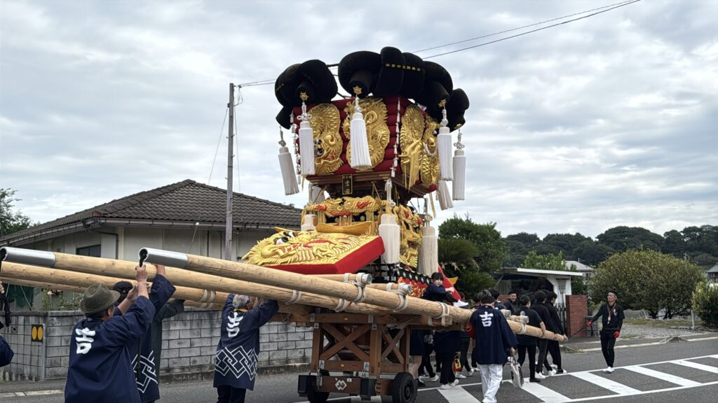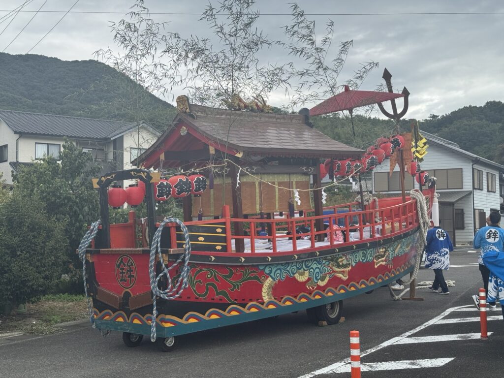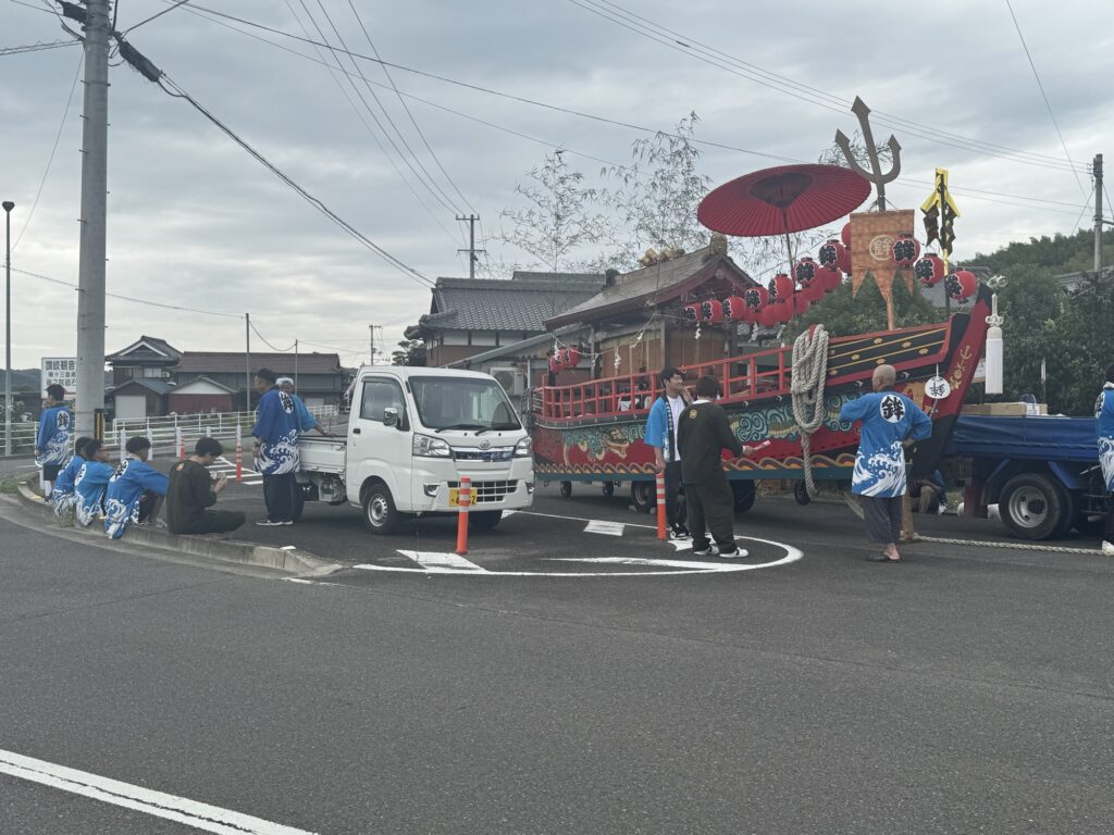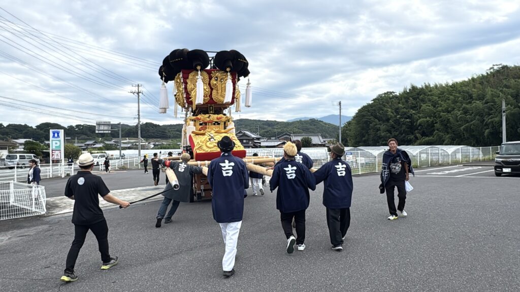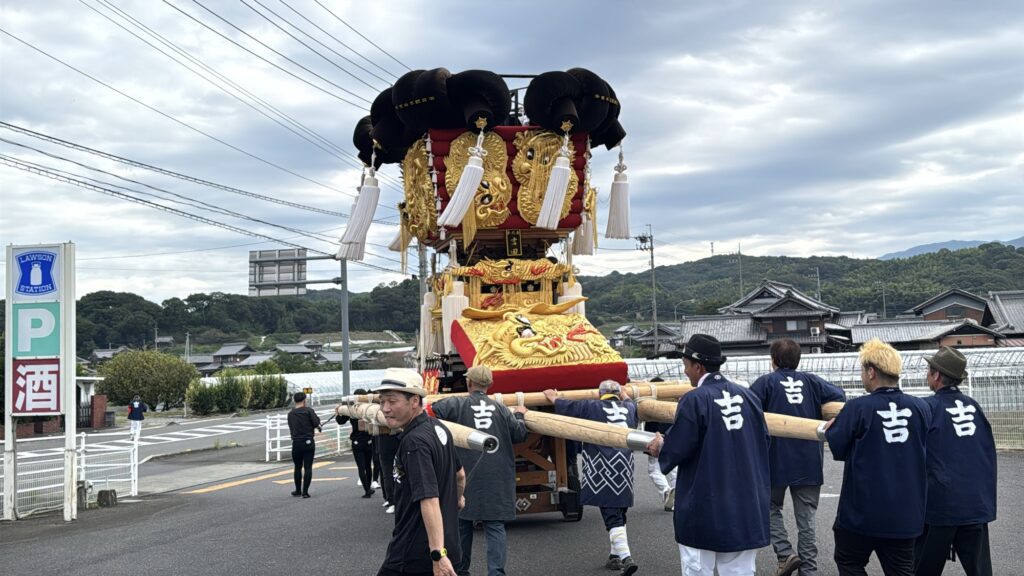 皆さまお疲れ様です。本日のブログでは鉾八幡宮に奉納される吉田太鼓台と北地鉾船をご紹介していきたいと思います。国道377号線沿いのローソン三豊山本店に行くと吉田太鼓台の姿がありました。