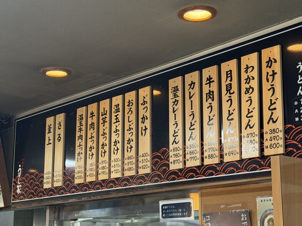こちらがセルフうどんうまじ家豊浜店さんのメニュー表です。かけうどんやわかめうどんと言ったレギュラーメニューはもちろんの事、カレーうどんや温玉牛肉ぶっかけ等もございます。また本日だと寒かったせいもあってか、釜上げうどんを注文されているお客様をよく見かけました。