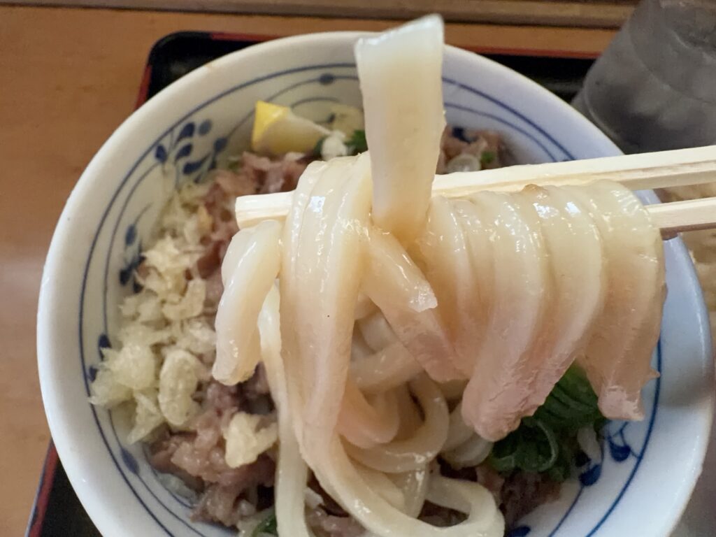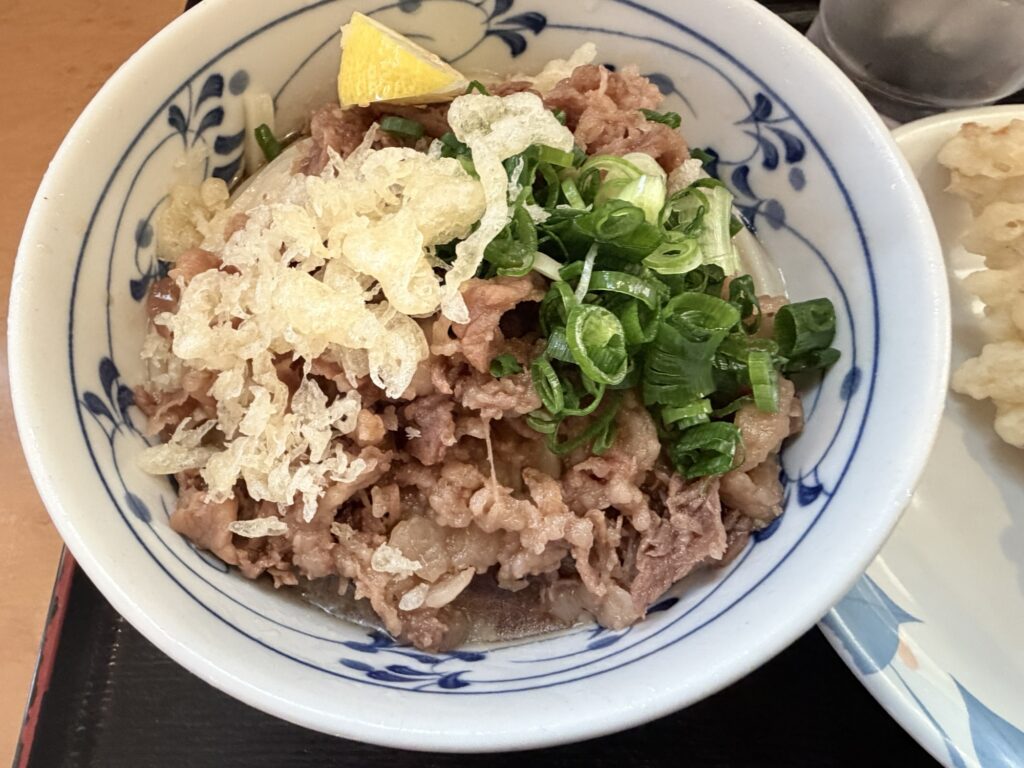 そして、メインである牛肉ぶっかけの見た目が下記のような感じです。牛肉の上にネギと天かすをトッピングする事で、美味しさもアップするので、皆さんもセルフのうどん屋に足を運んだ際にはぜひ、ネギと天かすをトッピングしてみて下さい♪