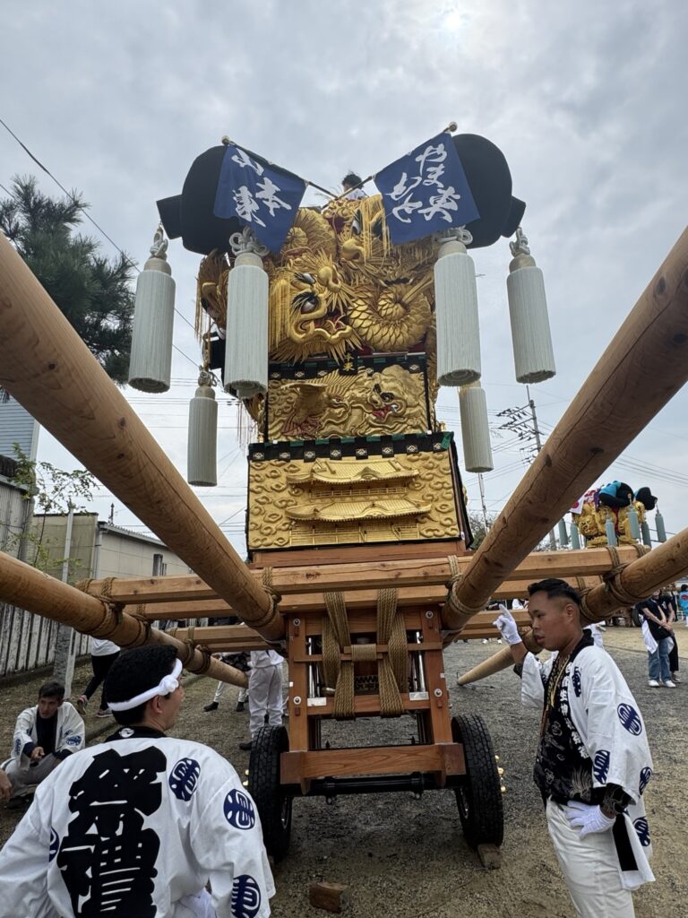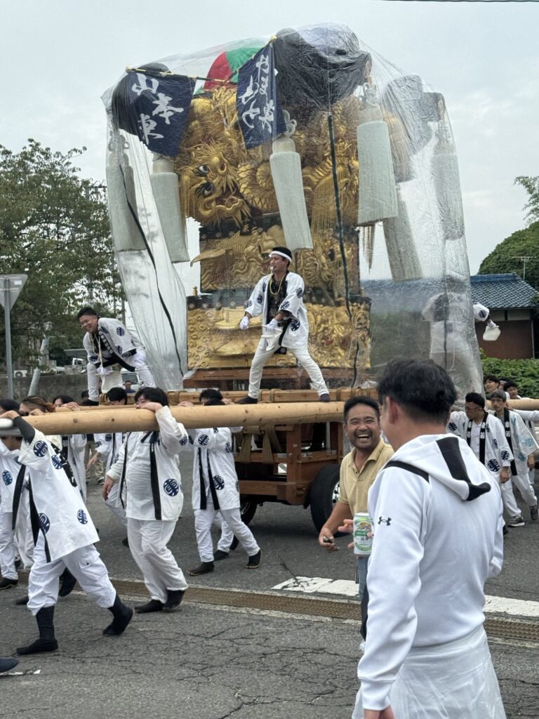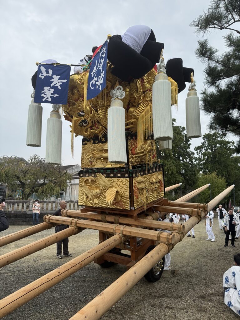 しかしこの日はあいにくのお天道様で、太鼓台にはビニールが被せられており、綺麗な刺繍と房を撮る事が難しい感じでした。