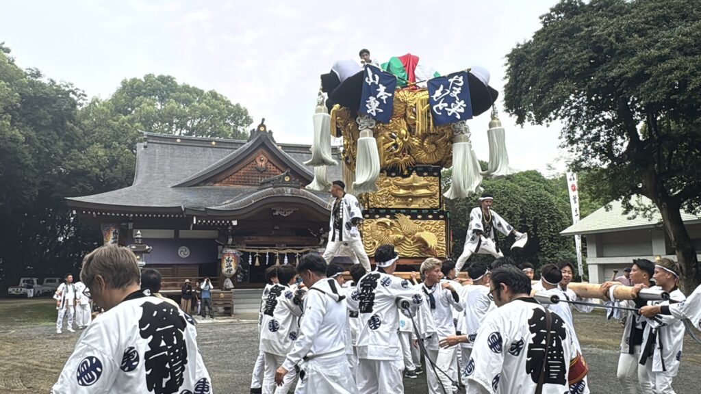 神社に宮入りです。皆さん楽しそうに太鼓台を引いていました。