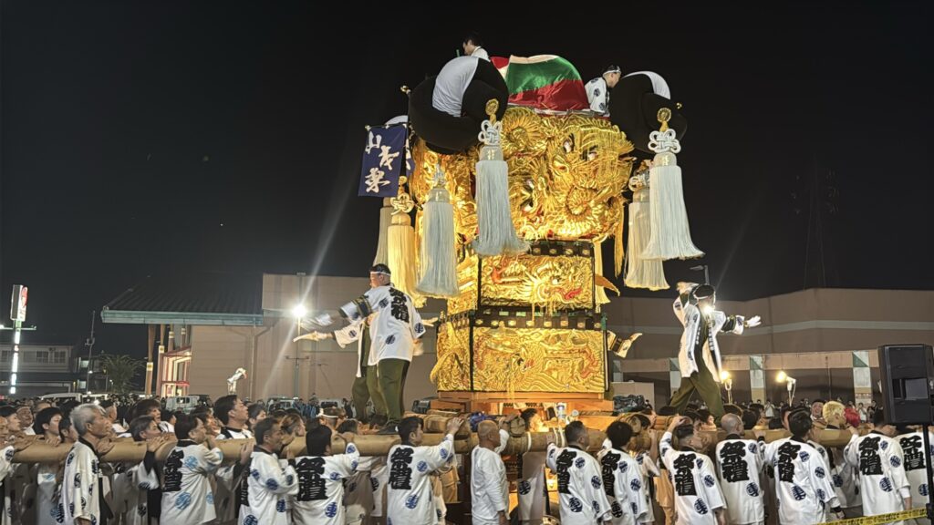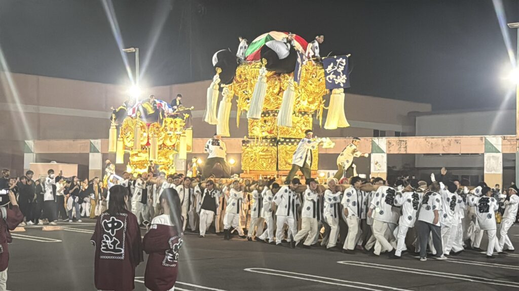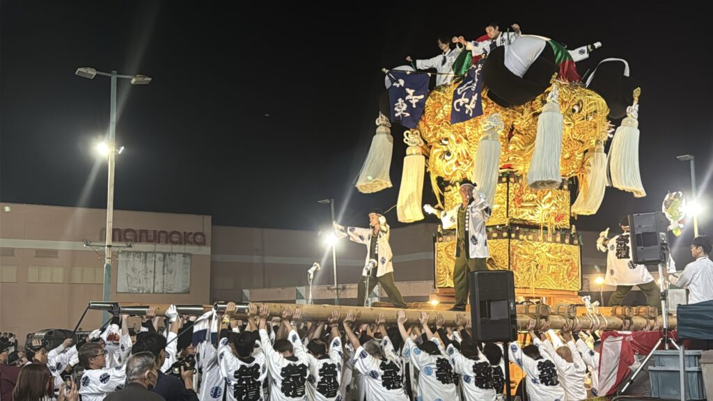 こちらは同日の夜、マルナカ山本店での太鼓台競演の様子です。暗闇の中でライトアップされる太鼓台の姿はやはり、勇壮華麗ですね♪