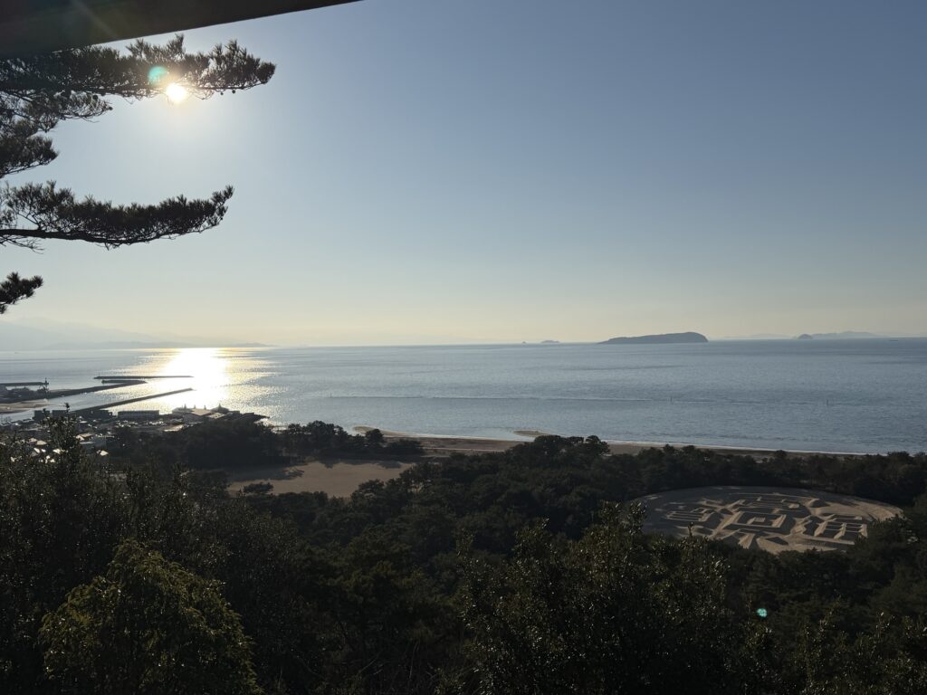 こちらは本日、夕方4時頃に撮影した銭形砂絵の写真です!!今日は雲も1つ無い青空が広がっていたので、瀬戸内海の沖合に浮かぶ伊吹島も綺麗に見えました。